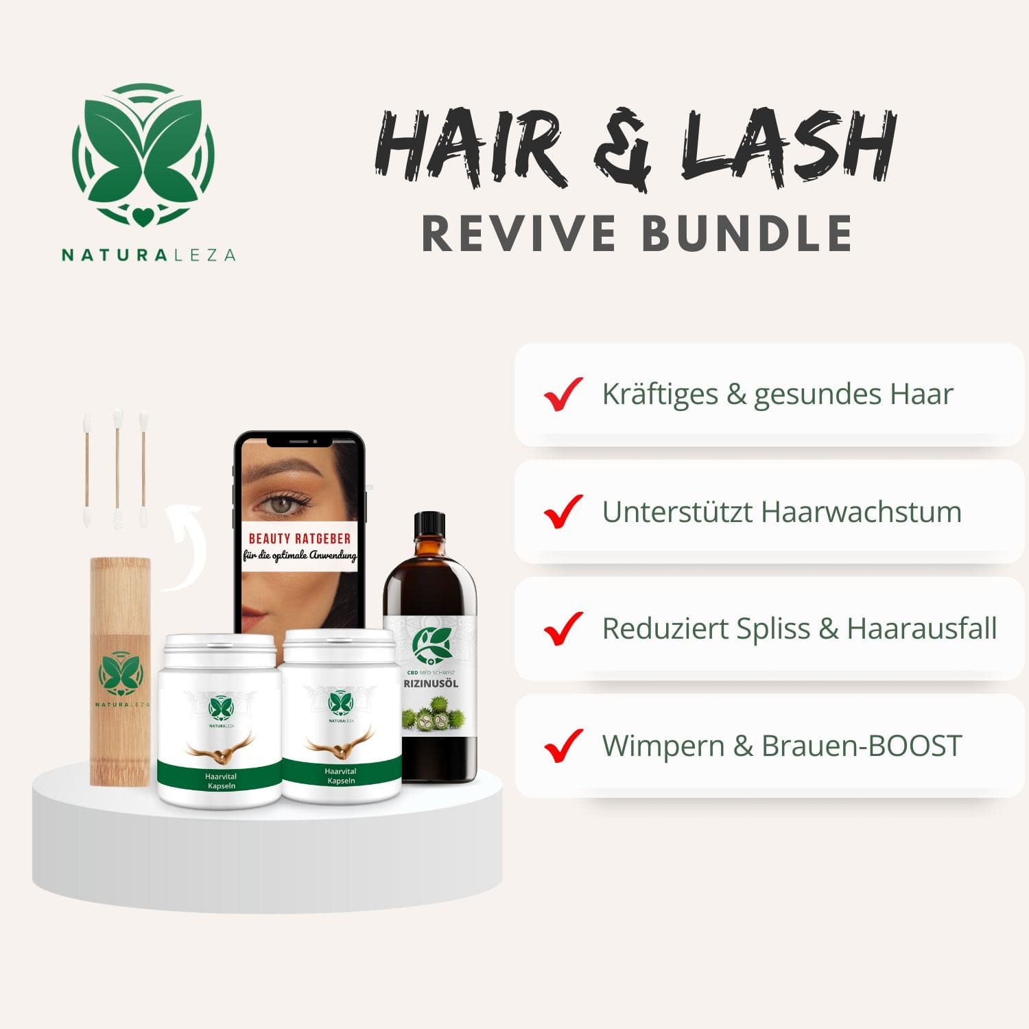 Verpasse nicht die Chance auf strahlendes Haar, volle Brauen und lange Wimpern! Bestelle jetzt unser Hair & Lash RevivePro Bundle und beginne deine Reise zu zeitloser Schönheit und Selbstvertrauen!